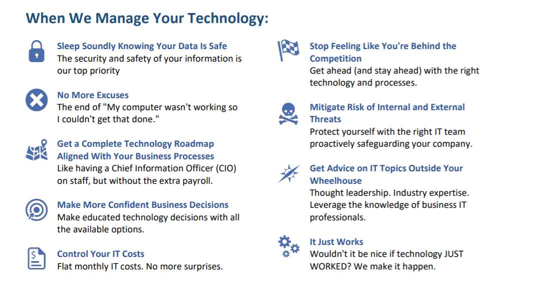 Our clients experience less downtime, reduced IT costs, increased worker productivity, and have a clear picture of where technology is going in their business..